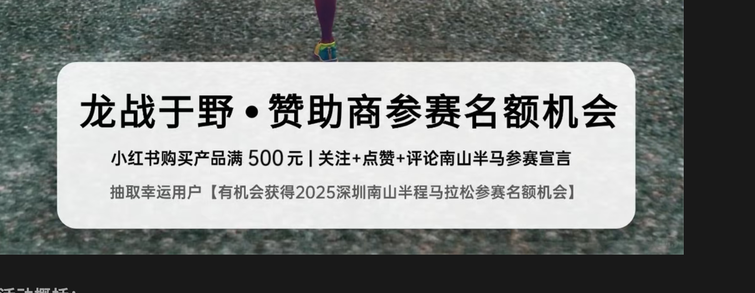 公开资料显示,此次南山半马的赞助商包括特步、天王表、龙战于野、迈胜等多家知名公司。从各大社交平台可以看到,上述赞助商均放出南山半马的参赛名额,用于品牌引流或销量引流。例如,南山半马顶级合作伙伴特步在小红书平台放出3个名额,网友关注特步小红书账号,发布小红书笔记分享此前参赛体育和使用特步的体验,带上特步的相关话题,并且@特步官方账号,即有机会获取参赛名额。特步官方还提到,笔记中如果露出特步装备可提高中奖概率。而赛事支持商龙战于野则是要求网友在小红书购买产品满500元后,关注+点赞+评论南山半马参赛宣言抽奖;官方赞助商迈胜则是要求用户购买特定商品,才能参与赞助商名额抽奖。