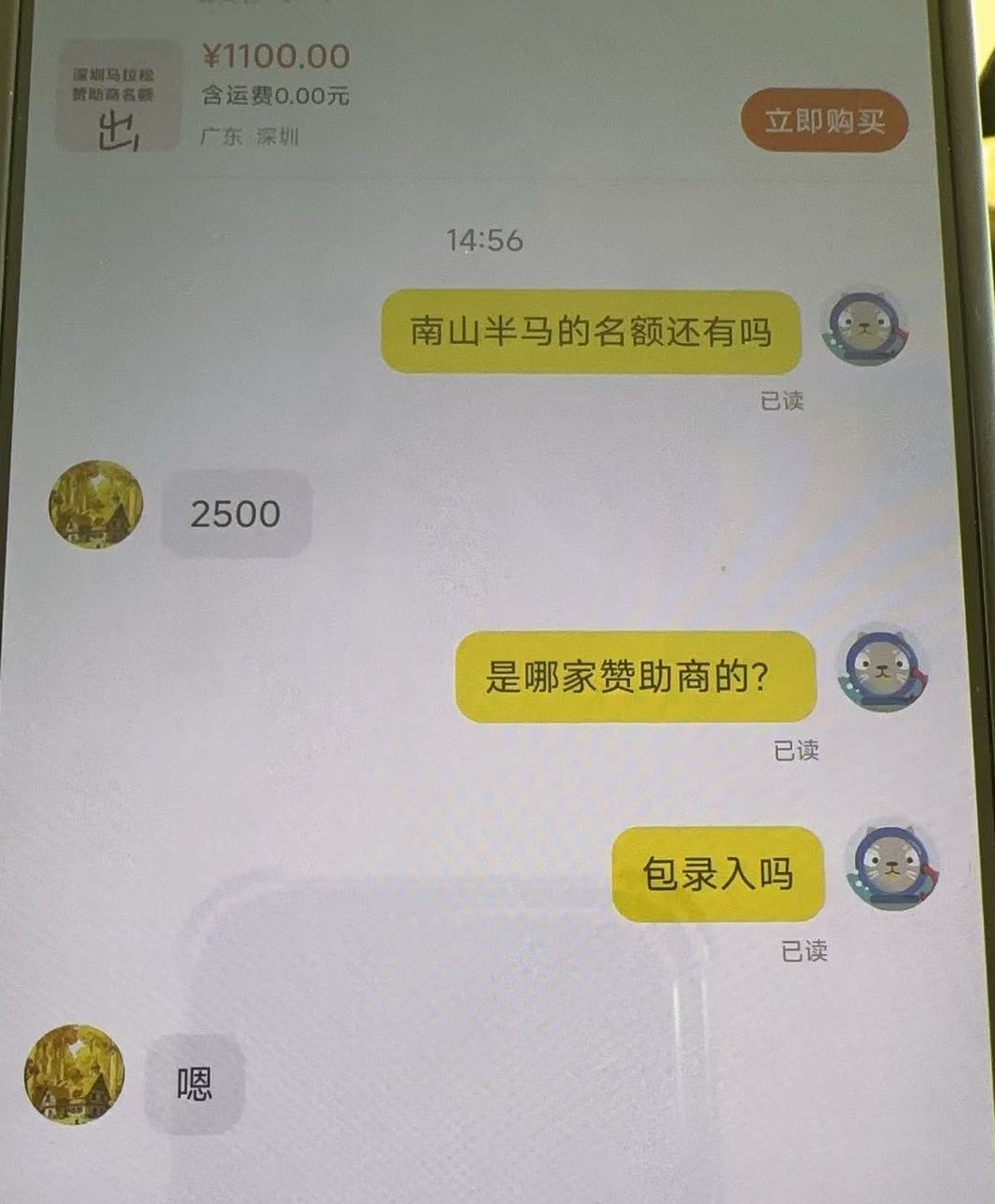 高门槛和不确定的中奖率,让跑友们望而却步。另一边,记者注意到,二手平台上悄然出现了多个南山半马“赞助商名额”。11月25日以来,记者以跑友的身份在闲鱼上咨询了数个转卖名额的卖家,发现这些名额标价在1000-3000元之间,且卖家均声称“包录入”。一位卖家告诉记者,商品详情页标价虽然写着1100元,但实际上需要2500元。“2500(元)包报名费,是赞助商的名额,包录入。”记者进一步询问能否便宜一点时,卖家直接拒绝并表示“你可以找其他人。”另一位卖家则表示,自己确实出售赞助商名额,但是目前不卖了。“赞助商的名额在上周就已经截止登记了,现在还在卖赞助商名额的大概率都是骗人的。”但25日晚上11时,该卖家突然联系记者称,还有一个名额,但要3000元,另外再送一瓶酒。