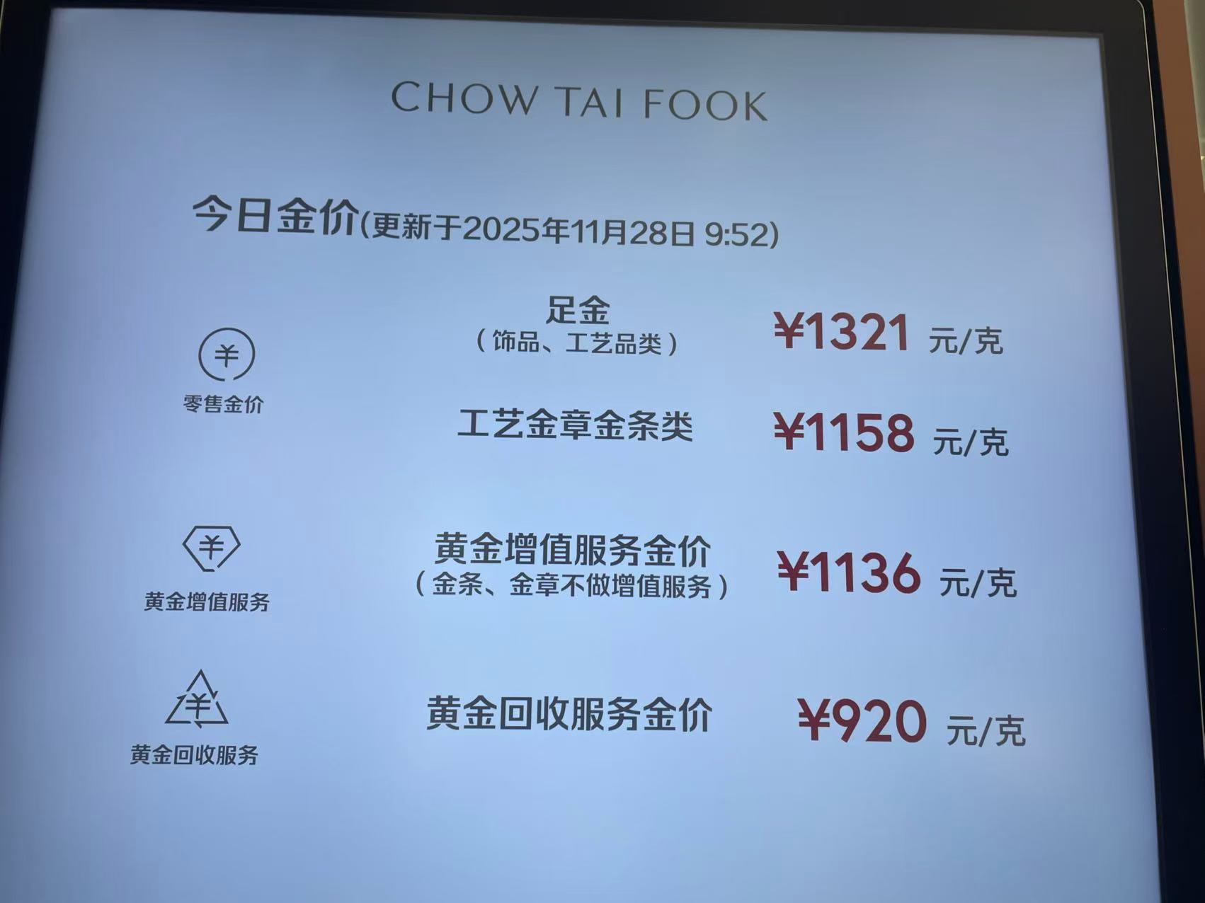 11月28日,记者以消费者身份,走进位于宝安中心壹方城的周大福,以及周大福荟馆店,发现当日金价已高达1321元/克。营业员为记者介绍了高端的“传承系列”,以及与故宫、迪士尼联名的定价款金饰系列。记者发现,部分高端产品算入工费,每克价格高达2000元。