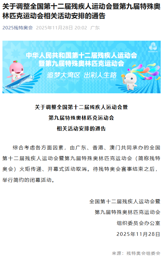 综合考虑各方面因素,由广东、香港、澳门共同承办的全国第十二届残疾人运动会暨第九届特殊奥林匹克运动会(简称残特奥会)火炬传递、开幕式活动取消。待残特奥会赛事结束之后,举行简约的闭幕活动。