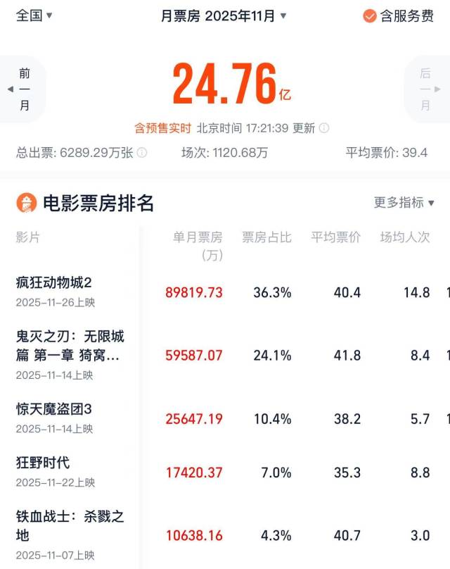 据灯塔专业版数据,截至11月28日17时21分,2025年11月票房(含预售)已突破24.76亿元,创下2019年以后11月单月最高票房纪录。