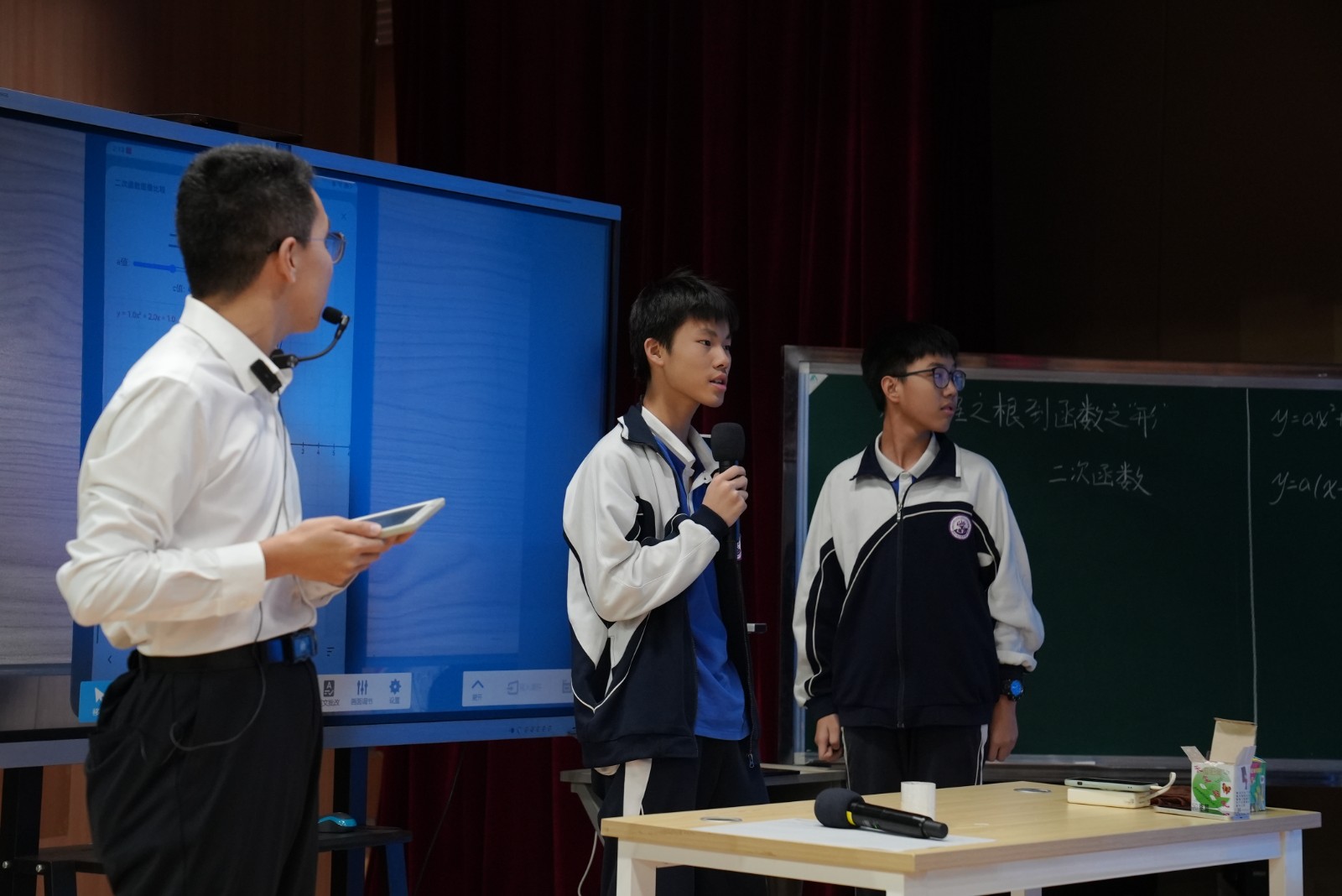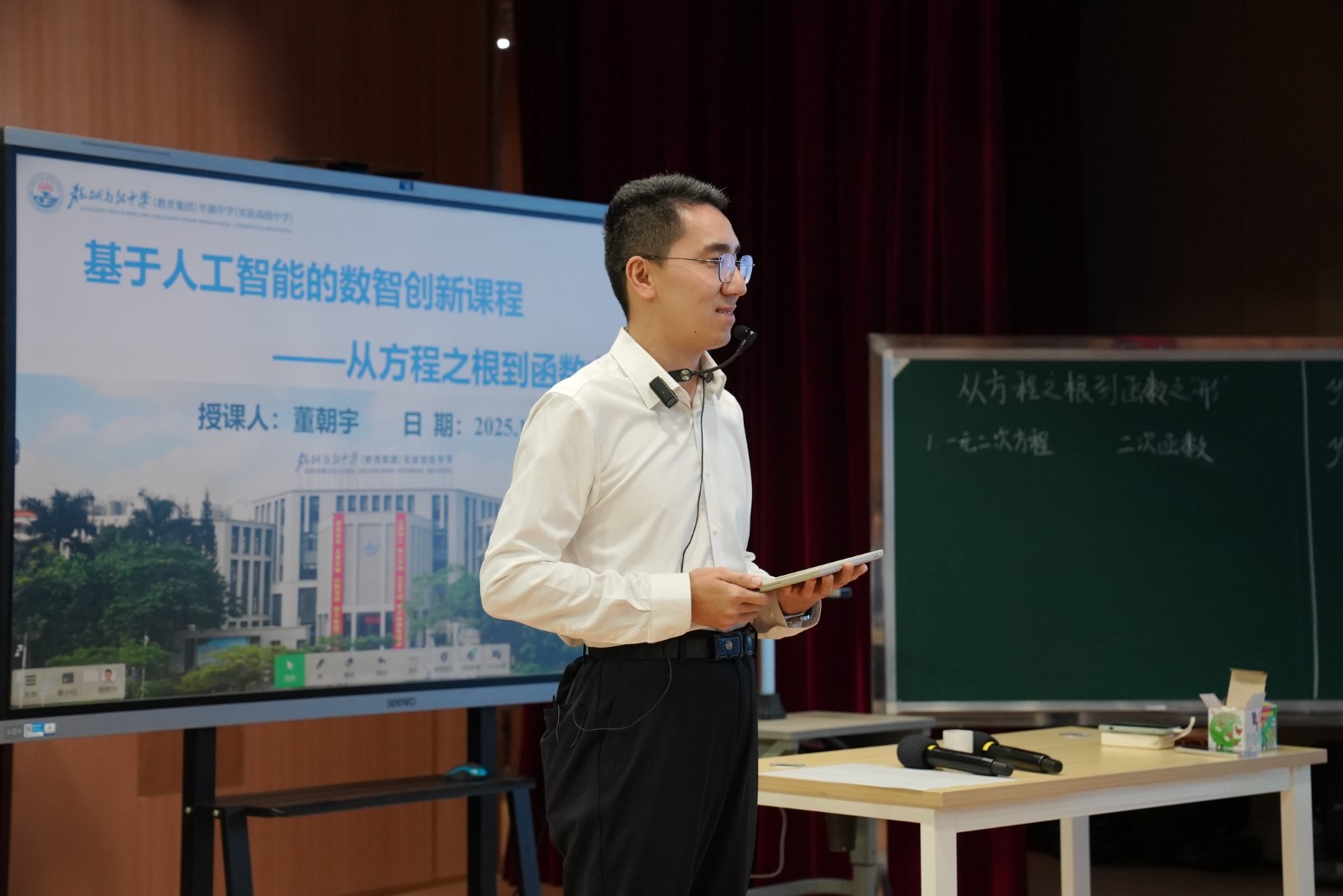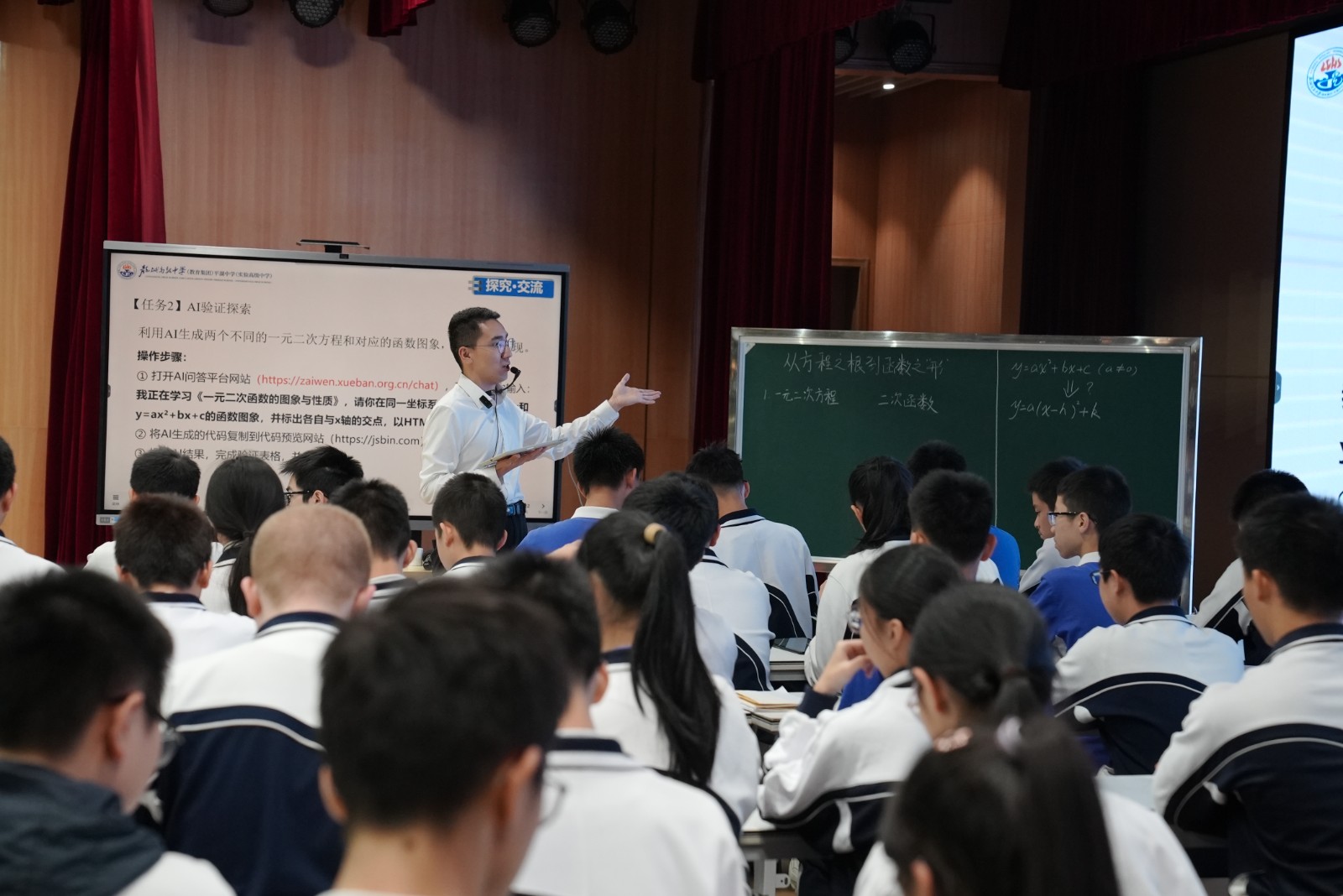 首堂公开课由平湖中学董朝宇老师执教《从方程之根到函数之“形”》。课堂上,借助每个小组一台的平板电脑,国产大模型成为“助教”角色,实时生成函数动态图像,将抽象的数学概念转化为直观的视觉表达。同时,AI根据系统实时分析的学情数据,向不同小组推送分层探究任务,实现了“千人千面”的个性化学习路径,课堂提问覆盖率与传统模式相比提升显著。