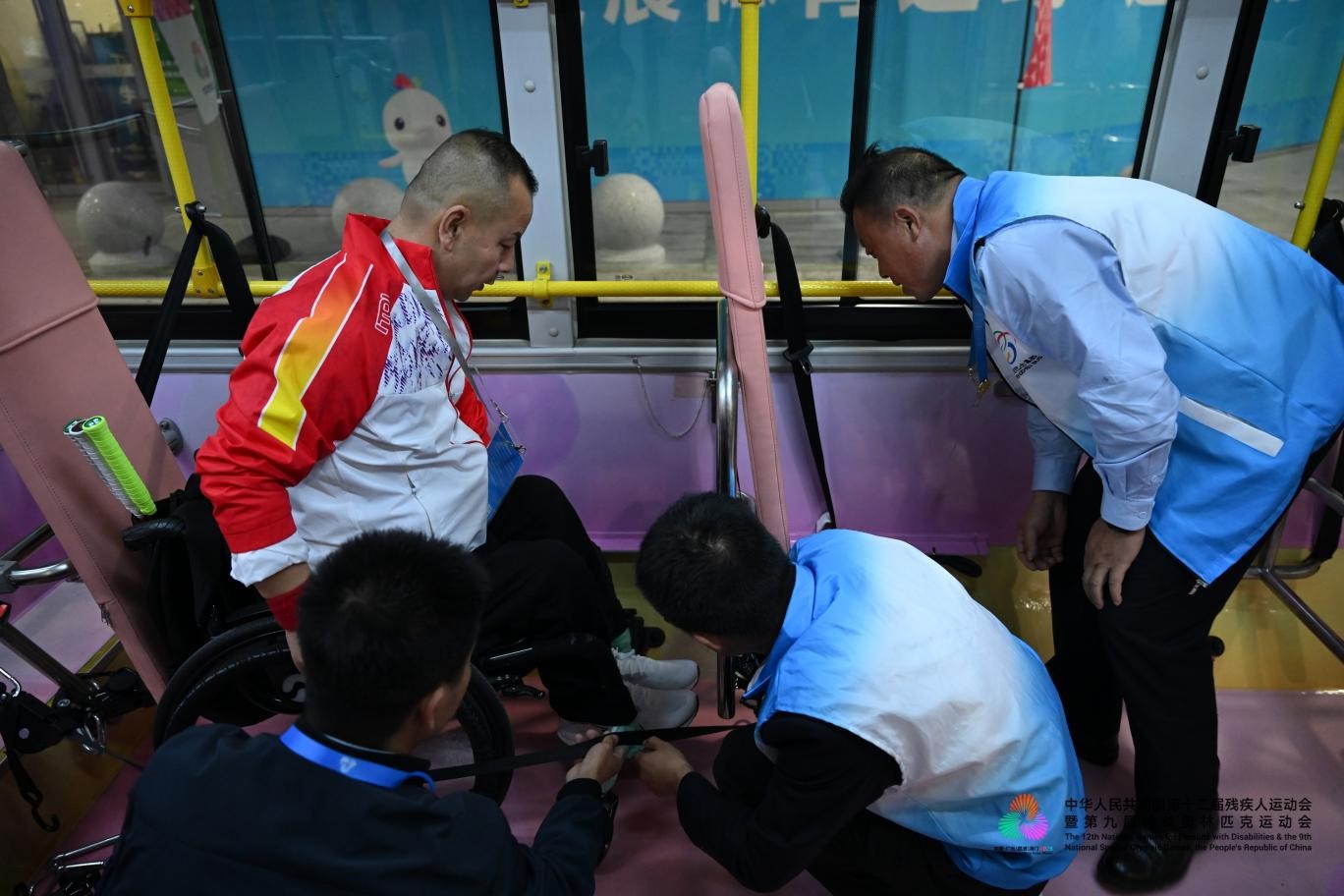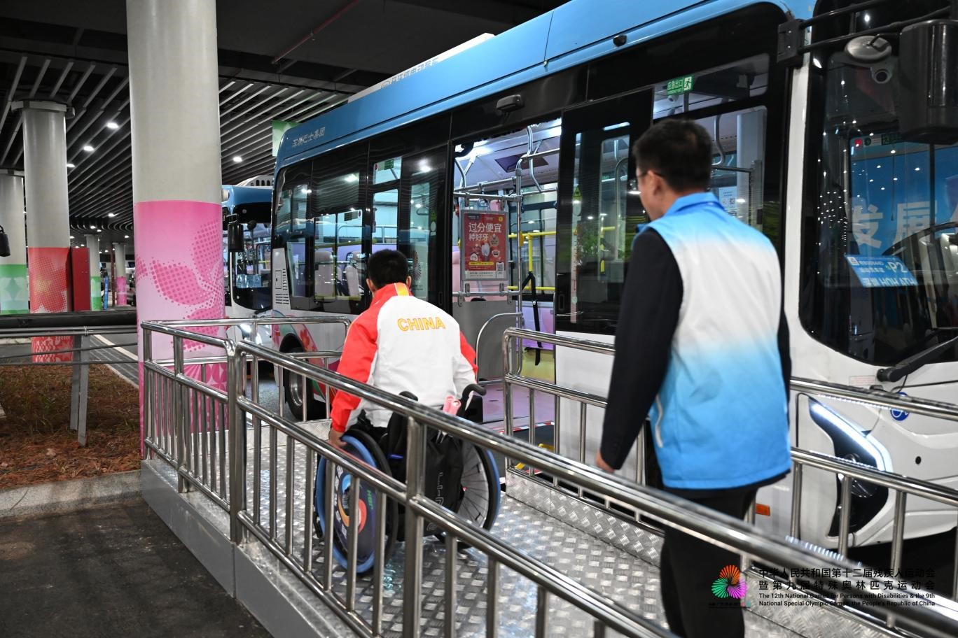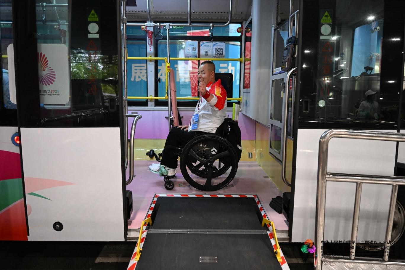 首个比赛日,从第一辆运动员班车驶入场馆区域开始,福田赛区“想在前面、做到心里”的理念就得到了贯彻。赛区为轮椅和下肢残疾参赛人员准备了无障碍公交巴士,用车上的折叠板与特制坡道连接,确保轮椅人士上下车全程顺畅。驾驶员与站点工作人员相互配合,将车辆准确停靠到连接处;运动员上车后,工作人员再将轮椅仔细固定,保证乘车过程中的稳定。这些细节体现了服务团队的暖心,赢得了参赛队伍的好评。
