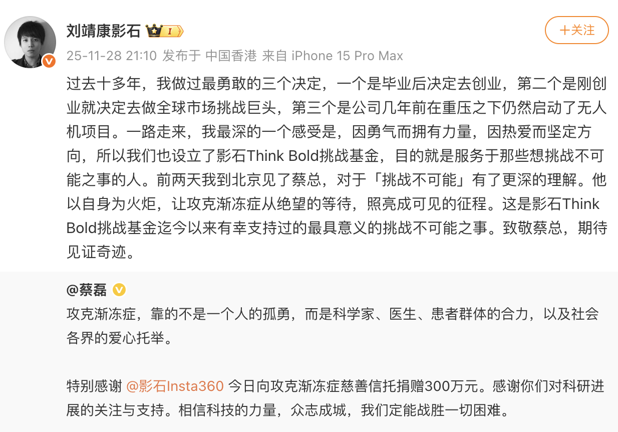 “前两天我到北京见了蔡总,对‘挑战不可能’有了更深的理解,”刘靖康表示,“他以自身为火炬,让攻克渐冻症从绝望的等待,照亮成可见的征程。这是我们影石Think Bold挑战基金迄今支持过的最具意义的挑战。致敬蔡总,期待见证奇迹。”