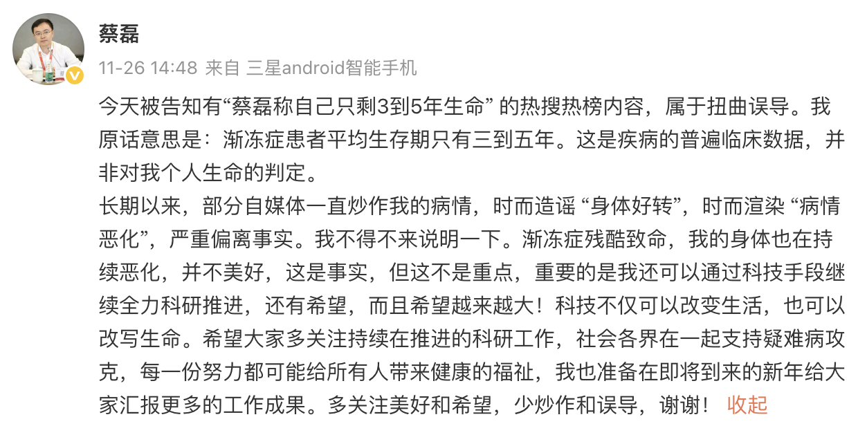 科技与爱心正汇聚成一股“破冰”渐冻症的强大合力。近日,蔡磊辟谣“个人生命仅剩3到5年”误解,强调其所指的是渐冻症患者平均生存期的医学数据。同日,他发文感谢深圳企业影石Insta360向攻克渐冻症慈善信托捐赠300万元。
