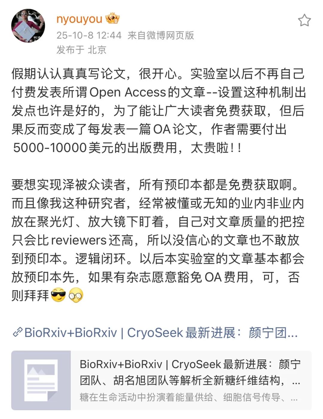 这一成果发布,也是颜宁对此前公开声明的实践。10月8日,颜宁曾发微博称,不再为OA发表支付高额费用,以后实验室的文章基本会先发预印本。预印本是指研究者未经正式同行评议而先行公开的论文版本。她指出,目前每发表一篇OA论文,作者要承担5000—10000美元的出版费用,“太贵啦”。“如果有杂志愿意豁免OA费用,可,否则拜拜。”