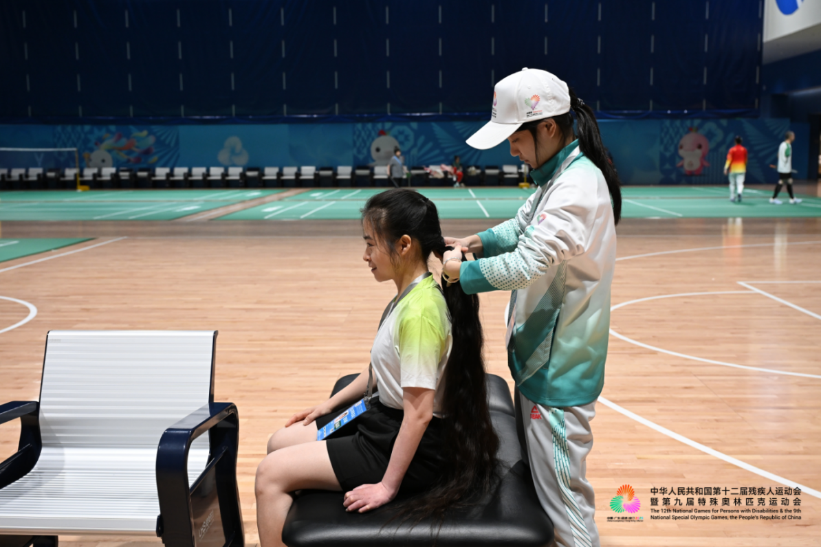 首个比赛日,“想在前面、做到心里” 的服务理念贯穿全程。针对轮椅及下肢残疾参赛人员,赛区调配无障碍公交巴士,通过折叠板与特制坡道衔接,实现上下车顺畅;驾驶员与站点工作人员配合精准停靠,上车后还会仔细固定轮椅,保障行程稳定。运动队抵达后,可沿精心设计的标识,以最优路线直达训练热身馆或竞赛区域;若有需要,经过轮椅推行、基础手语等多轮培训的 “小海豚” 志愿者会及时提供协助,各个服务点位还会开展针对性培训,确保服务精准高效。