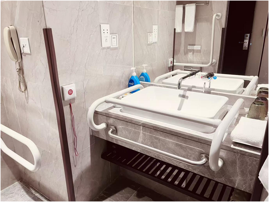 作为赛事承办地的深圳福田赛区,延续了此前承办十五运会羽毛球赛事时备受赞誉的“温度服务”,将无障碍理念深度融入赛事接待与场馆运行的每一个细微环节。在运动员入住的酒店,55间轮椅友好房与30间听障友好房已提前布置就绪。为保障行动不便运动员的通行与隐私,洗手间门被贴心卸除并安装门帘;低位洗手盆、紧急报警按钮、淋浴扶手、冲凉座椅、拐杖架等便民设施一应俱全,从生活细节处传递着对运动员的尊重与关怀。