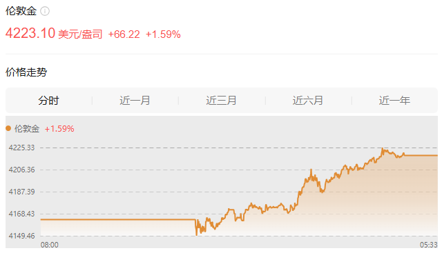 截至发稿前,现货黄金报4223.10美元/盎司,涨幅达1.59%,COMEX黄金期货同步上涨,报4256.4美元/盎司。