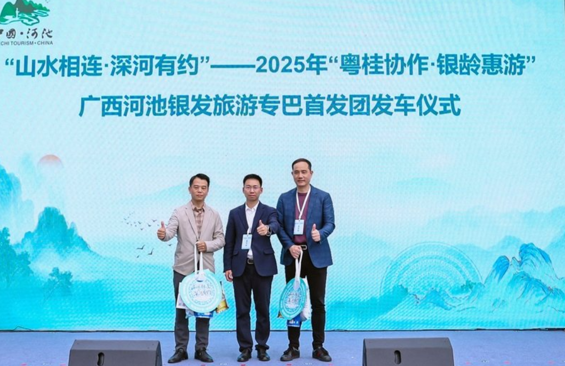 活動期間,還隆重舉行了“山水相連·深河有約”——2025年“粵桂協作·銀齡惠遊”廣西河池銀發旅遊專巴首發團發車儀式,河池市人民政府副秘書長、粵桂協作工作隊副領隊、河池工作組組長 奉均衡為組團旅行社代表發放河池大禮包。河池市委常委、宣傳部部長、一級巡視員 孔獻玲,深圳市鄉村振興和協作交流局副局長 劉得勝,河池市人民政府副秘書長、粵桂協作工作隊副領隊、河池工作組組長 奉均衡,河池市人民政府副市長 翟紅玲,深圳市文化廣電旅遊體育局旅遊推廣處二級調研員 林清雄,河池市文化廣電體育和旅遊局黨組書記、局長 韋鴻臻,深圳市旅遊協會副會長、深圳市旅行社行業協會會長 徐國棟,河池市旅遊協會秘書長 王芳,深圳市暖心國際旅行社有限公司總經理 鄧樂平,桂林市假期之旅國際旅行社有限責任公司深圳第一分公司總經理 曾華共同啟動發車,標志著“冬遊廣西·康養河池”大灣區遊客輸送通道正式開啟。首批大灣區遊客將前往河池,體驗“冬遊廣西·康養河池”的獨特魅力。兩地將以此為契機,進一步深化深河農文旅協作,將河池打造成為粵港澳大灣區的重要旅遊目的地和康養勝地。