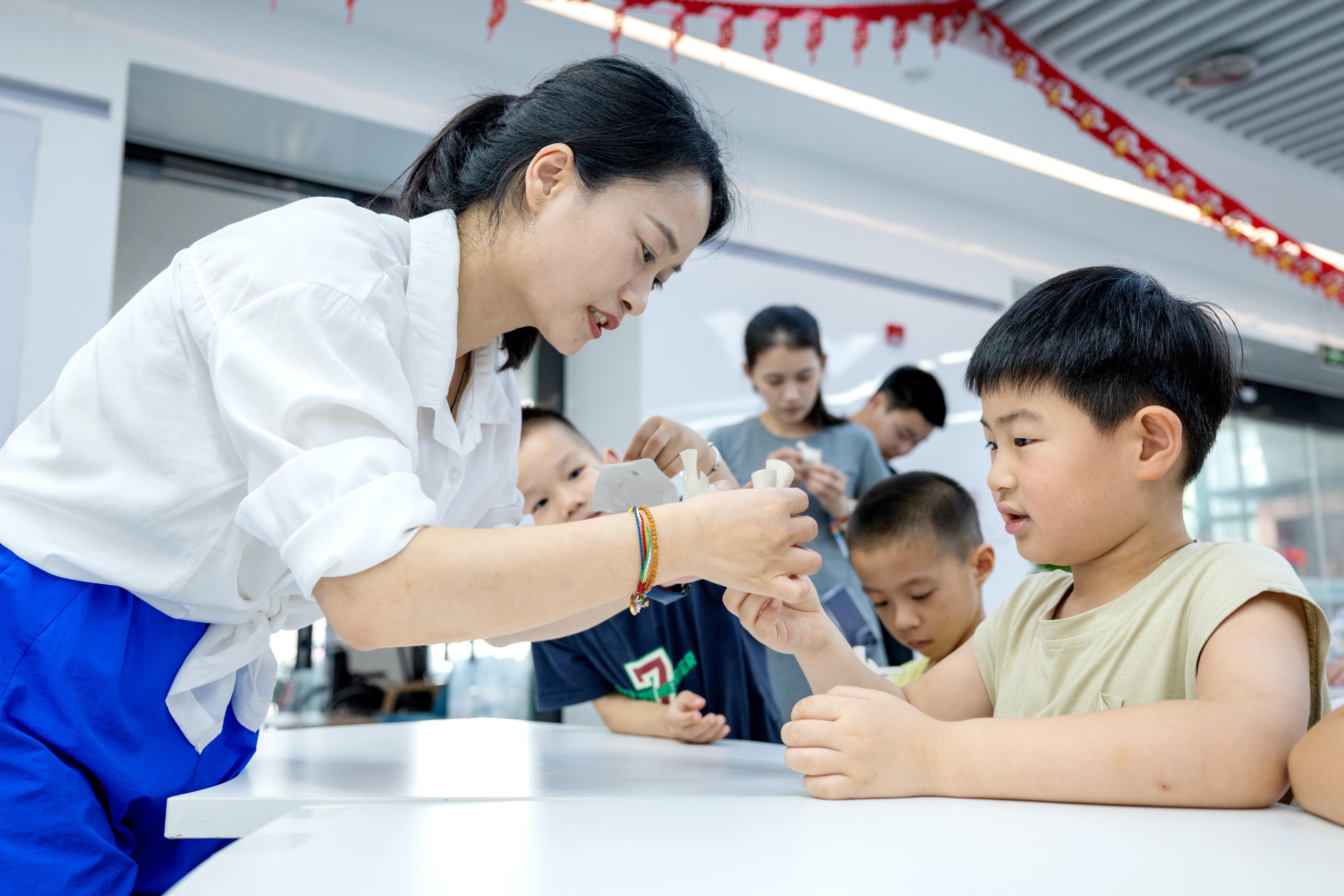 2025年7月3日,浙江湖州长兴县龙山街道齐北社区幸福邻里中心,志愿者指导孩子们制作手工。