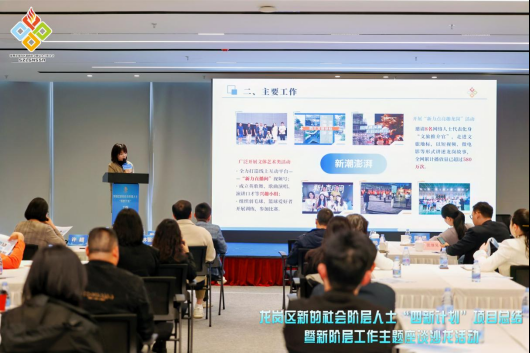 随后,活动进入总结汇报环节。区委统战部党派科科长温海媚就2025年度“四新计划”的执行情况作了系统、深入的汇报。汇报围绕“新秀领航”“新锐赋能”“新潮澎湃”“新风同行”四大板块,详细阐述了在思想引领、能力提升、作用发挥、组织建设等方面开展的具体工作、创新举措与显著成果,充分展现了龙岗区新的社会阶层人士在服务区域经济社会发展、参与基层治理、弘扬正能量中的积极作为与责任担当。
