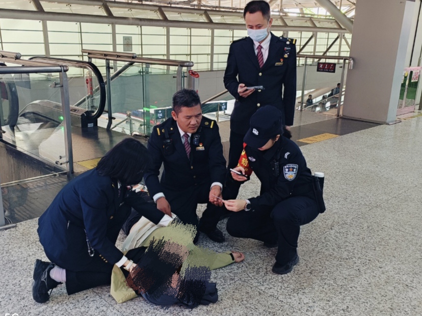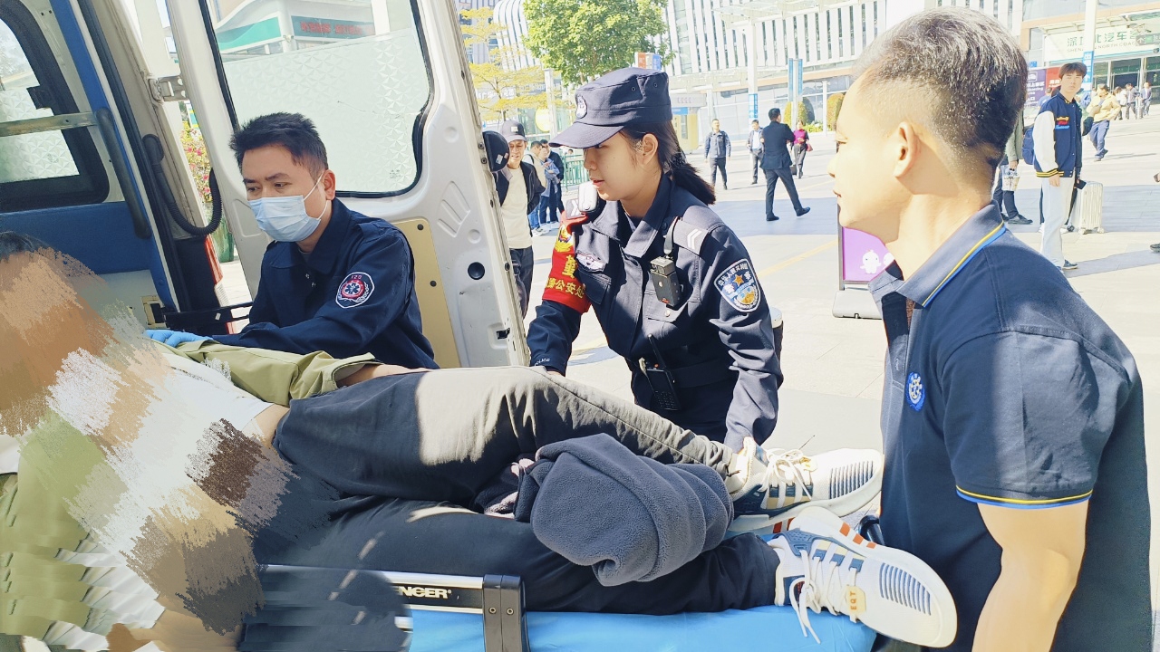 11月26日11时50分许,深圳北站正值午间客运小高峰,进出站口人流如织。巡逻中的民警廖思涵突然听到站内广播反复响起:“各位旅客请注意,现北通廊便捷换乘附近有旅客需要医疗帮助,如有医护人员,请迅速前往……”廖思涵心头一紧,立即朝着北通廊方向飞奔而去。