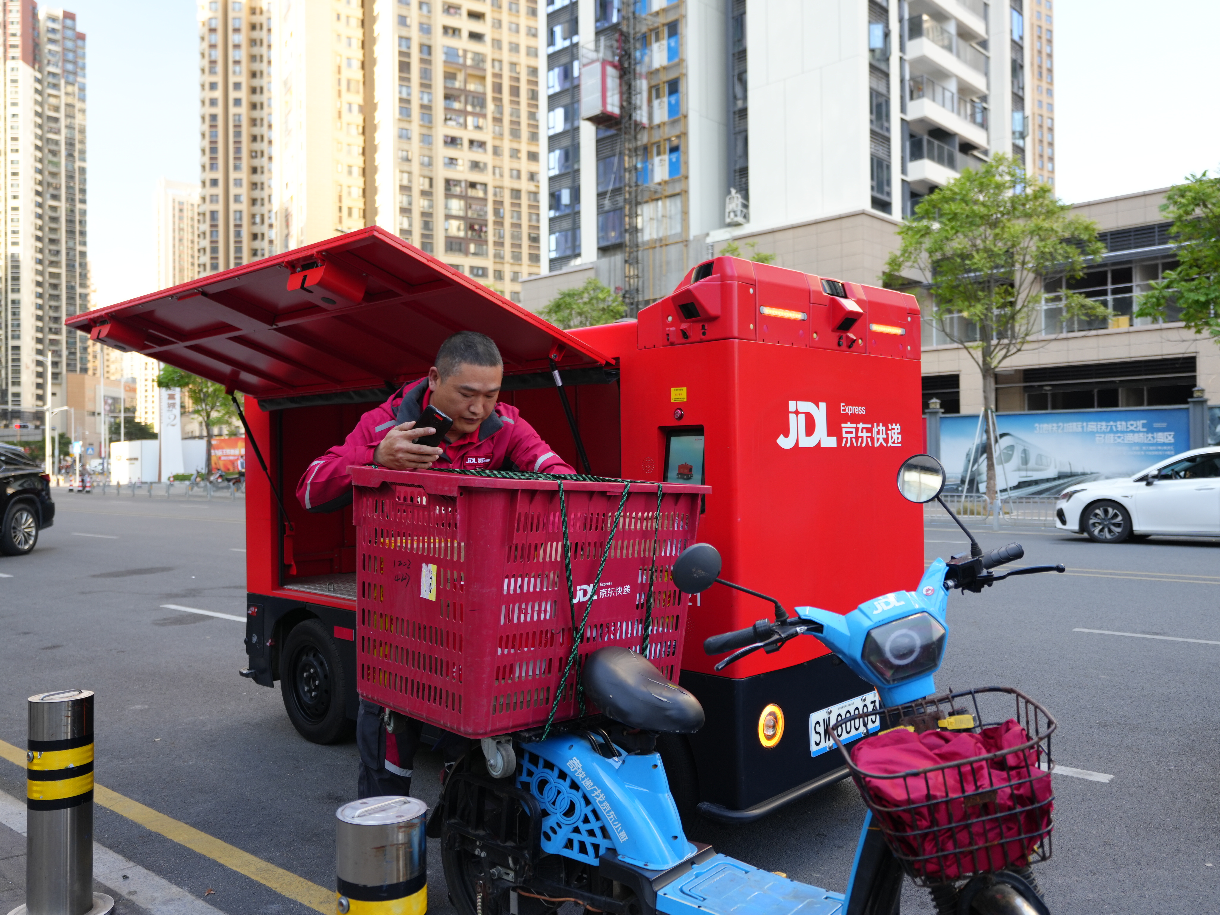 在李先生所在的小区,京东物流“独狼”第六代无人车常年进行社区快递配送服务,无人车与京东快递小哥组成了人车CP,当快递包裹到达末端站点后,将被进一步分拣并装入无人车,并独自运输至小区门口,京东快递小哥只需在门口理货并送货上门即可。京东快递小哥张繁长期服务这一小区,“自从有了这个工作‘搭子’,我能够专注地在小区进行揽收和派送,节省了不少往返时间,揽派量也提升了不少”。如今在深圳,京东物流无人车配送规模位居行业前列。