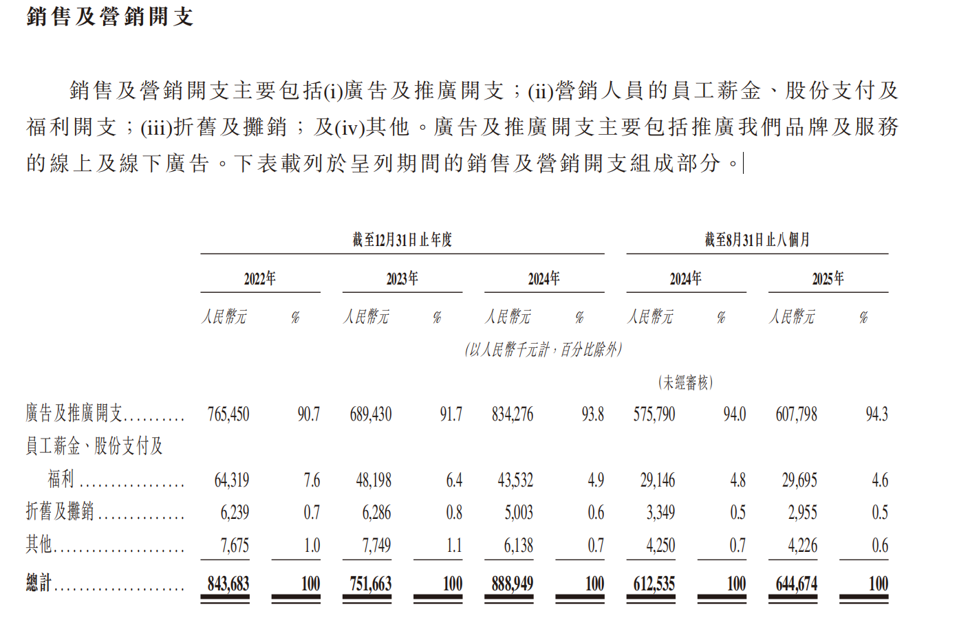 业内认为公司出现净亏损主要是因为在广告方面进行了高投入。招股书显示,Soul的销售及营销开支中,绝大多数用于广告及推广开支。2022年至2024年,公司支付的广告及推广开支分别为7.65亿元、6.89亿元、8.34亿元,2025年前八个月为6.08亿元。也就是说,三年多来Soul在广告和推广上,支付了接近29亿元。招股书还表示,包括推广、投研开支在内,公司成本及开支日后将会随者其扩大用户群及增加用户参与度,以及发展及实施更复杂的新功能及服务而继续增加。