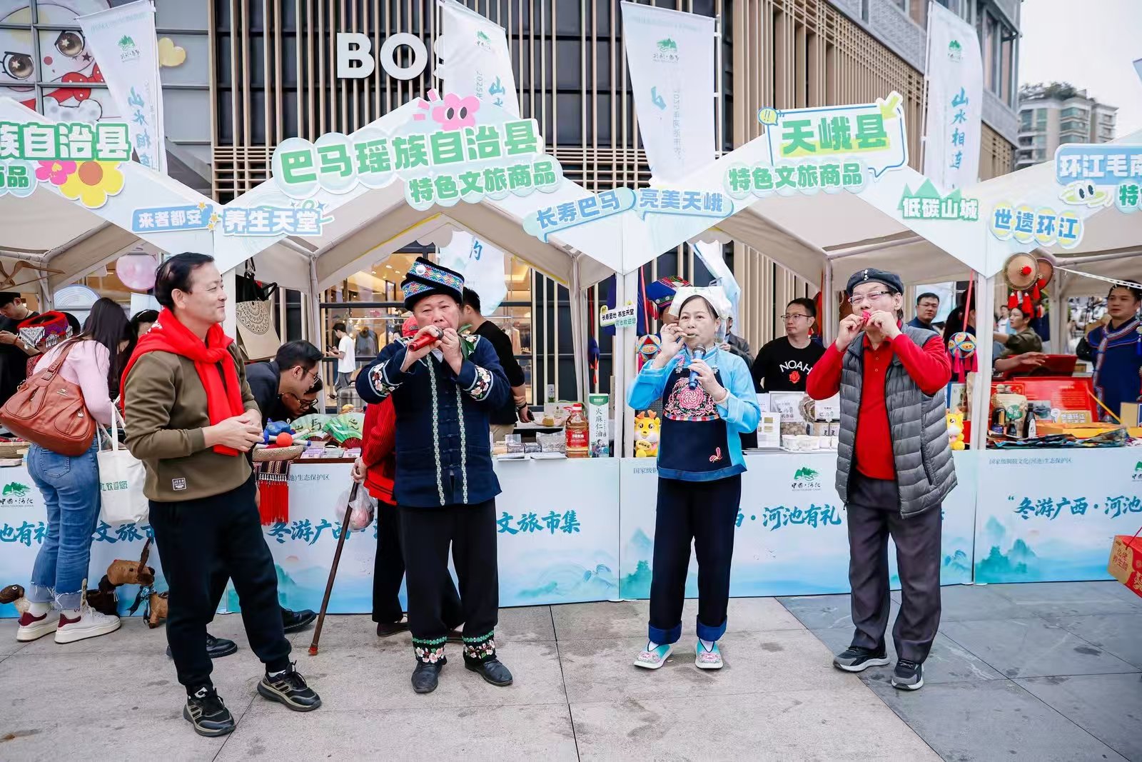 市集围绕河池农文旅产品,及国家级铜鼓文化(河池)生态保护区的非物质文化,将传统与现代、文化消费与体验经济相结合,让参会嘉宾和湾区市民在“食、游、购、娱”中感受“生态长寿市·三姐文化城”的魅力。