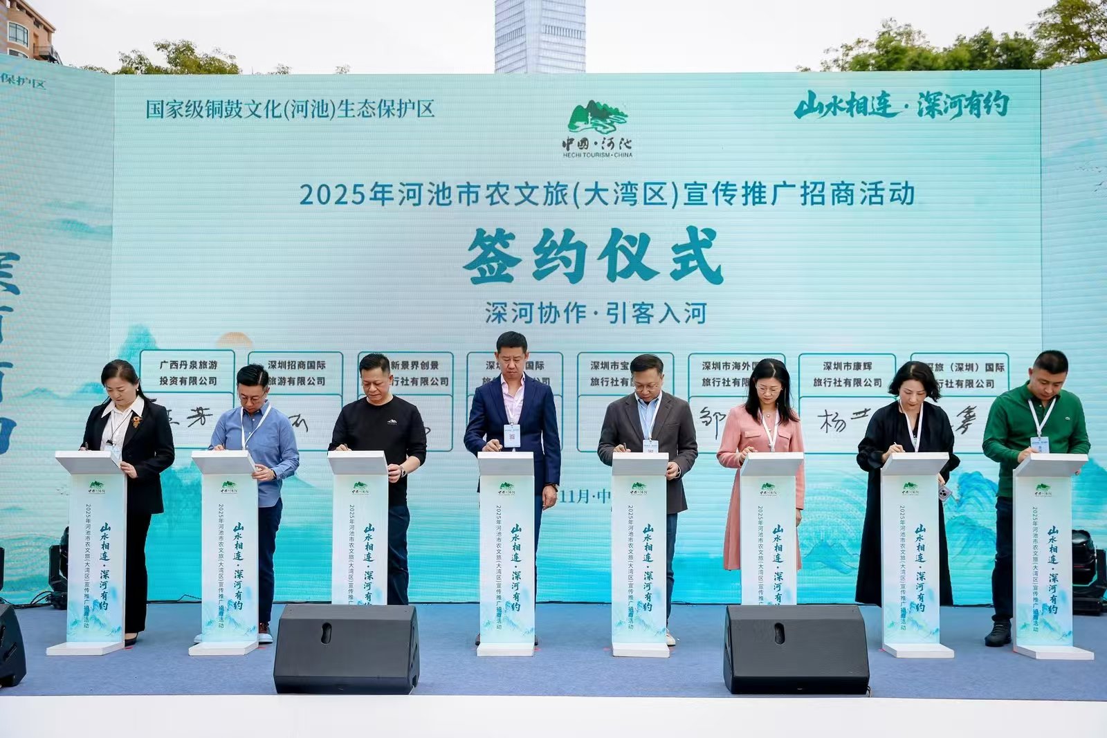 山歌绕鹏城,铜鼓迎客来。11月30日,山水相连·深河有约——2025年河池市农文旅(大湾区)宣传推广招商活动在深圳举行。活动通过文旅推介、项目签约、民俗展示、农文旅市集等多种形式,全面展示河池作为“生态长寿市·三姐文化城”的独特魅力和丰富的农产品。