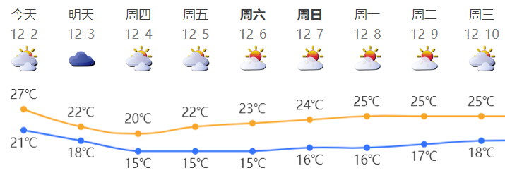 【今日天气】阴天间多云,有零星小雨;气温21-27℃;东风2-3级;相对湿度60%-90%。