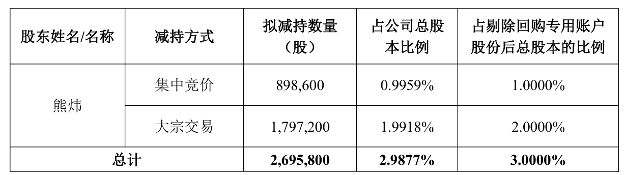 12月1日晚间,开勒股份(301070)发布公告称,公司大股东熊炜计划自本公告披露之日起15个交易日后的3个月内以集中竞价、大宗交易的方式合计减持本公司股份不超过269.58万 股,占公司总股本比例不超过2.9877%。