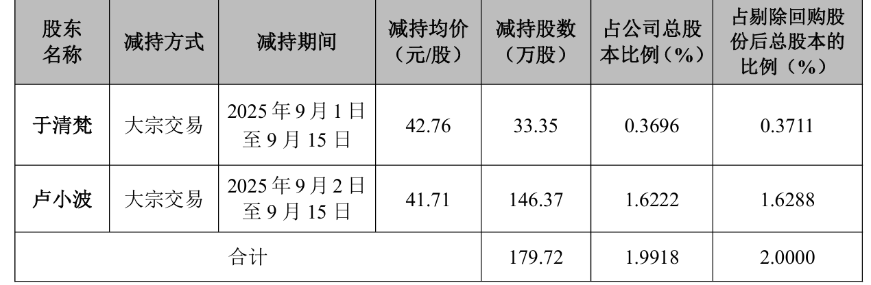 9月1日至9月15日,公司控股股东、实际控制人卢小波及其一致行动人于清梵分别减持了146.37万股、33.35万股,合计占公司总股本的1.99%。据计算,两人累计减持金额约7531万元。