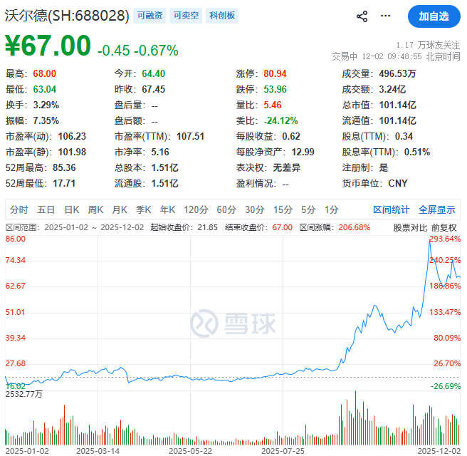 二级市场上,截至发稿,沃尔德下跌0.67%报67.00元/股,总市值约101.14亿元。今年以来,公司股价已涨206.68%。