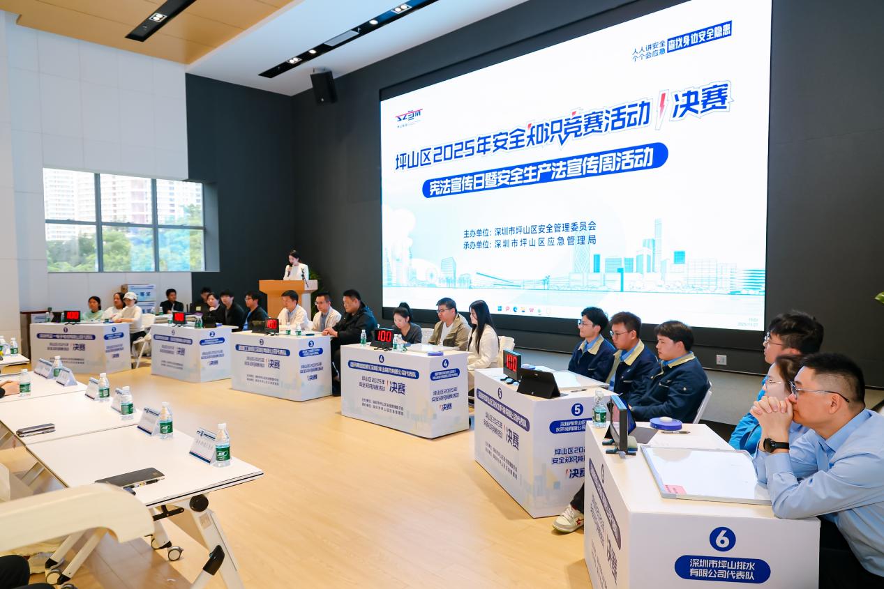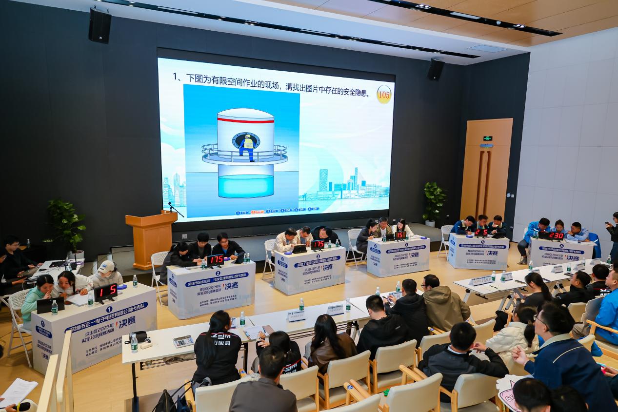 “下图为有限空间作业现场,请找出图片中存在的安全隐患?”“安全生产隐患举报电话是多少?”近日,坪山区2025年安全知识竞赛决赛在坪山区工匠园三楼报告厅举办。6支晋级决赛的代表队展开激烈角逐,最终,深圳市坪山排水有限公司代表队摘得桂冠。