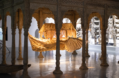 在展厅里,那些来自南岛语系、太平洋岛屿、东南亚山地部落的文物,与数字作品构成立体叙事。比如:蒙古艺术家诺敏·博尔德的纤维雕塑《距太阳8分钟》悬挂在来自巴基斯坦的百年木亭“Baradari”下,死亡与仪式在光线与空气中重新呼吸。范勃的影像《归途》让诸神背影沉入海面,与千年佛像形成无声对视。刘可与罗灵的《顺德威尼斯计划》直面城市更新的真实残酷——当废墟变成素材,记忆如何被保存?