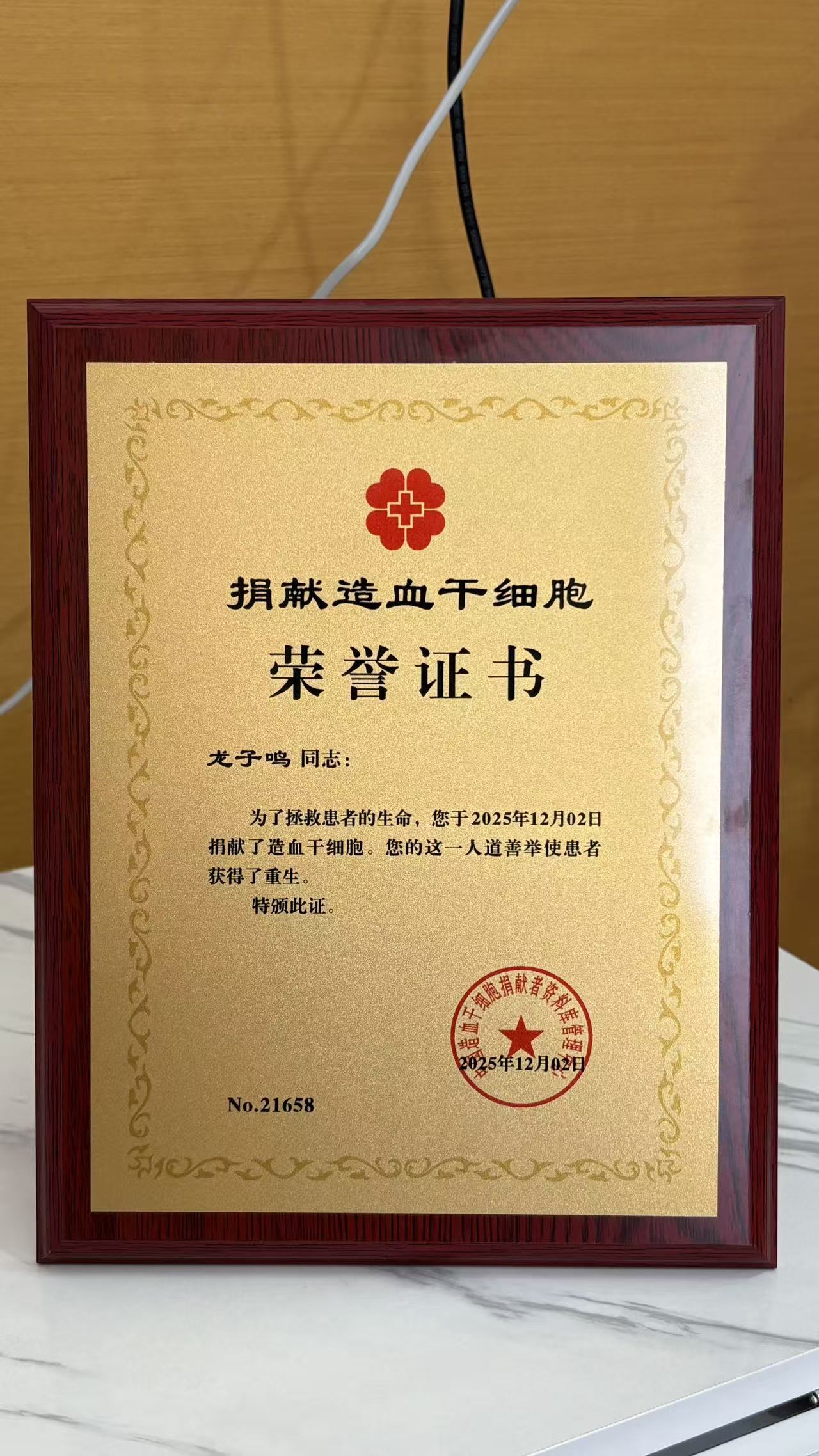 2022年,还在读本科的龙子鸣在湖北献血时加入中华骨髓库,留了8毫升血样。今年10月,他接到与患者配型成功的电话,在体检合格后,进入了捐献流程。“听说患者与我同龄,我希望对方也能像我一样拥有健康的身体,追求自己的梦想。”龙子鸣说。