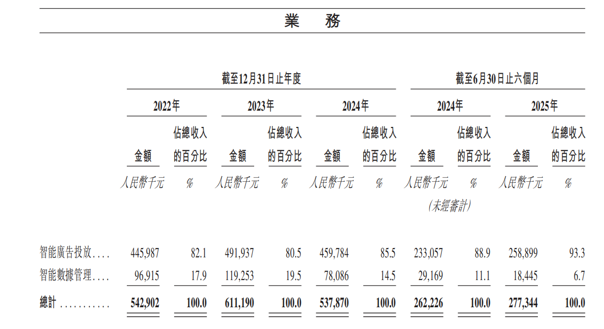 业务结构方面,深演智能智能广告投放业务收入占比长期超80%,2025年上半年更是提升至93.3%;而智能数据管理业务占比从17.9%降至6.7%,且该业务2024年收入同比下降34.5%,业务结构失衡导致抗风险能力较弱。
