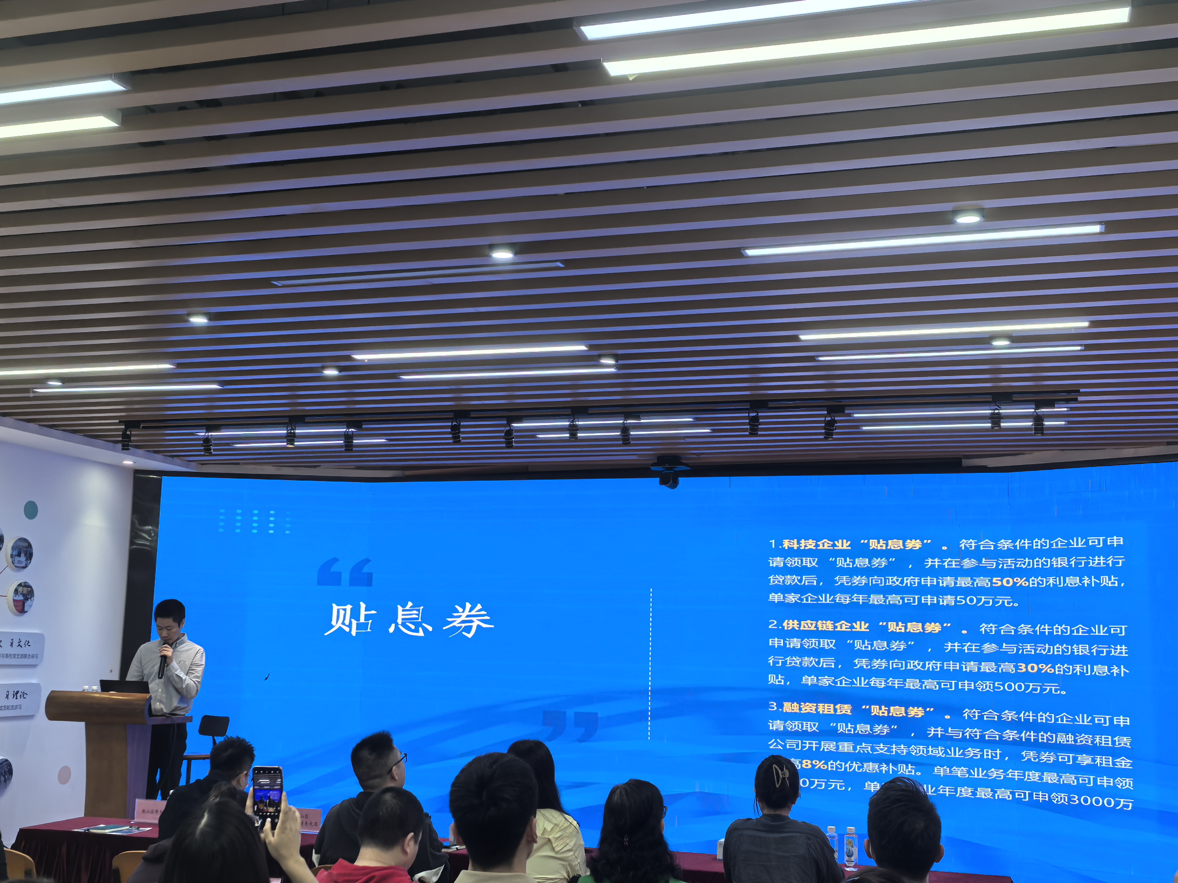 随后,南山区商务局与工业和信息化局的工作人员聚焦 “六个券” 政策中产业发展精准补贴的核心要点展开讲解。其中,“模型券” 对企业AI相关投入给予50%的补贴,精准契合科技企业研发需求;“贴息券” 每年最高补贴3000万元,为企业融资减负增效,此外还有覆盖多个领域的专项补贴券,全方位满足企业不同发展阶段的多样化需求。值得一提的是,本次活动还特别邀请了4家银行的代表到场,面对面为参会者提供金融服务咨询,打通政策扶持与金融支持的联动通道。