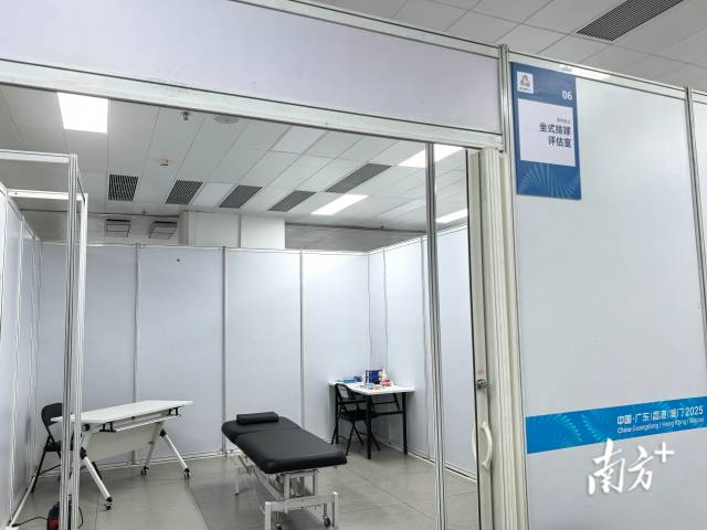 在分级中心内,设置了14间独立功能评估室、5片标准化等候区域。评估室内,根据项目不同,摆放着各类器材和设备。例如,坐式排球评估室内,配备了可以调节高度的检查床,方便运动员顺利接受评估。