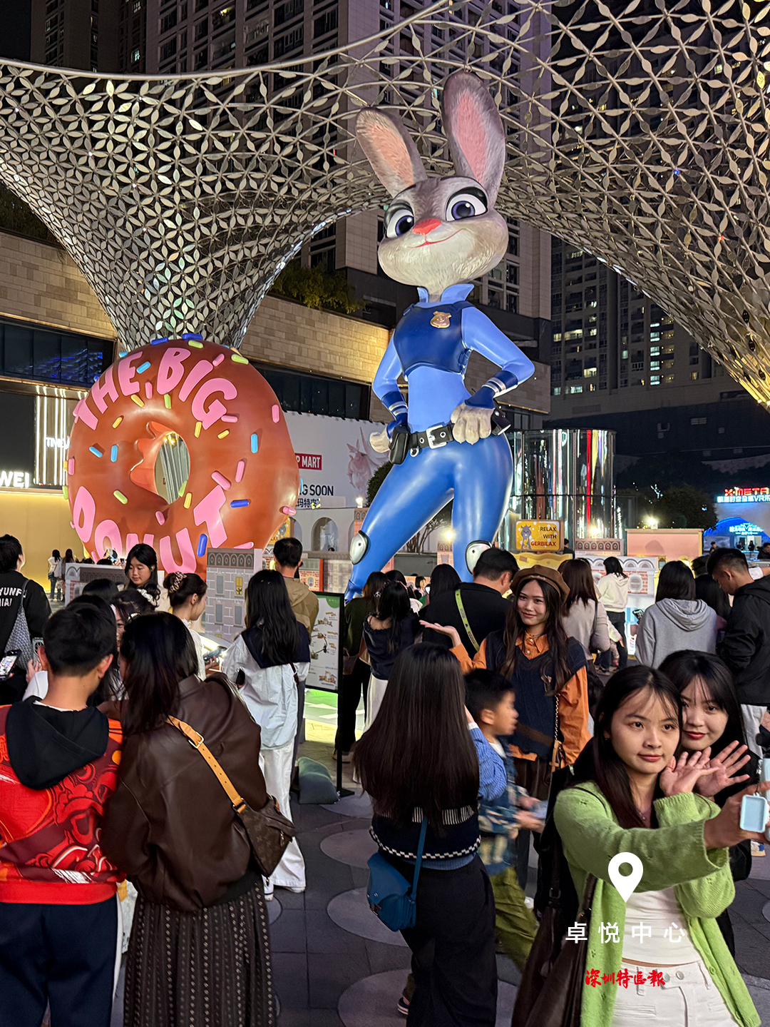 近日,深圳卓悦中心,高达8米的“朱迪警官”雕塑和巨型甜甜圈成为市民热门打卡点。许多市民在此与经典角色形象合影,感受电影中的欢乐场景。