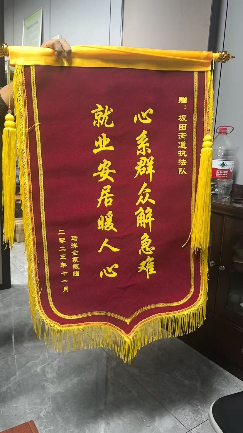 为表达对街道领导及工作人员的感激之情,马成炳老人携家人特意制作了锦旗和感谢信,亲手送到坂田街道执法队,向执法队领导及所有参与帮扶的工作人员表达最诚挚的谢意。