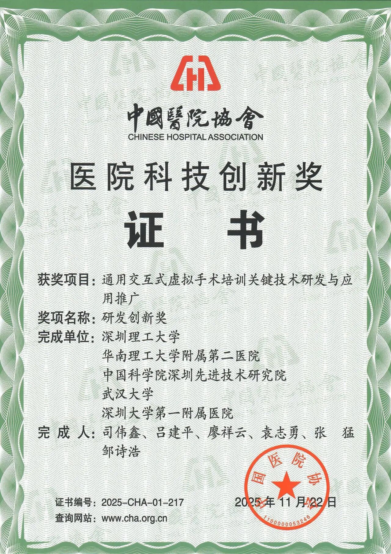 在人才培养方面,团队已将虚拟手术技术融入本科生与研究生的科研实践体系,通过“学中做、做中学”的模式,培养虚拟现实技术在医学领域应用的专业人才。司伟鑫还指导深圳理工大学研究生参加中国医院协会首届模拟医学创新大赛,成功斩获二等奖,以科研实践为人才成长赋能。