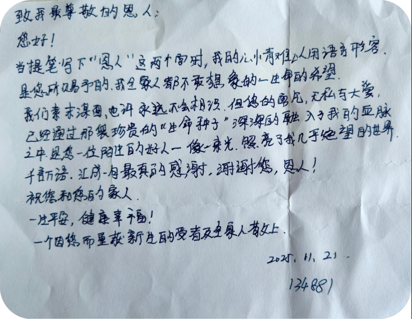 受捐者在信中写道:“是您所赐予的,我全家人都不敢想象的——生命的希望……您像一束光照亮了我几乎绝望的世界。千言万语汇成一句最真的感谢,谢谢您,恩人!”