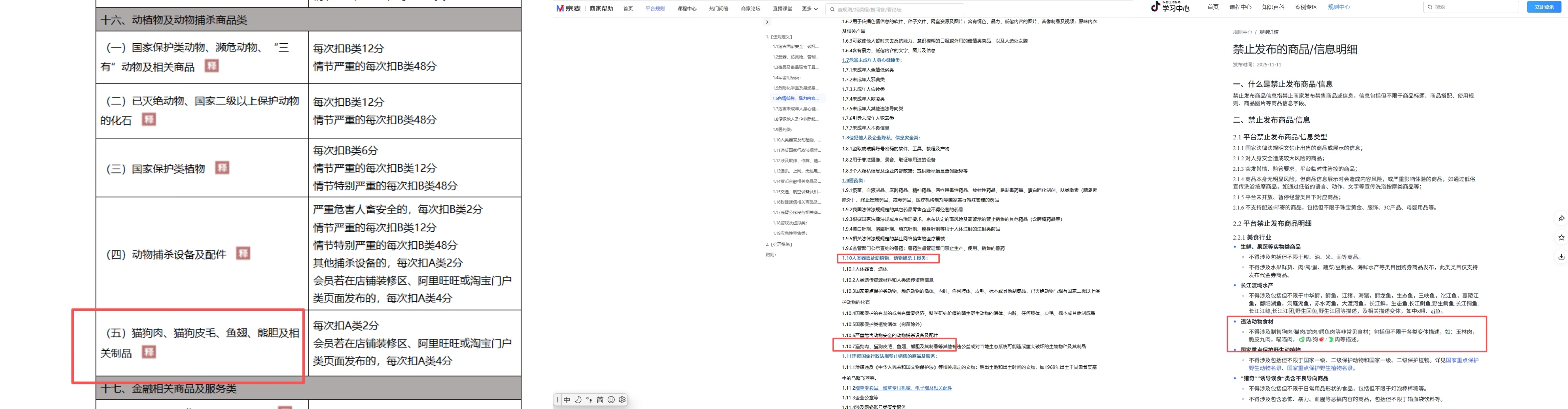 其中,淘宝在《淘宝平台违禁信息管理规则》中提到禁止售卖猫狗肉、皮毛等,违规将面临商品下架、店铺处罚等措施;京东在《京东开放平台发布违禁商品及信息管理规范》规定将狗肉及其制品列入禁售清单,违者可能被下架商品、扣除违约金或清退店铺等。