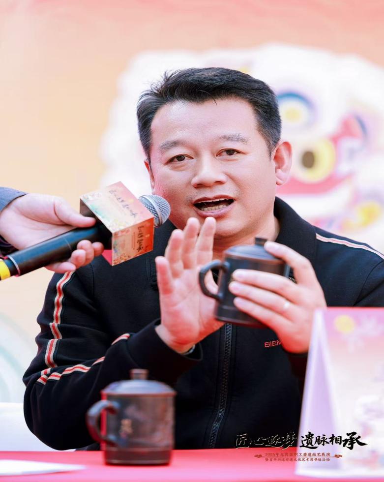 决赛现场设两大竞技赛场,既有动态展演的澎湃激情,亦有静态工艺的匠心独运。非遗展演类赛场上,鼓点铿锵,雅韵流转。《平湖纸龙舞》以灵动飘逸的腾转姿态搭配雄浑鼓点节拍,尽显省级非遗的灵动神韵;箜篌弦歌《云中君》借清越婉转的丝弦音色,将楚辞意象与古典意境深度交融,流淌出仙韵缥缈的艺术感染力;汉乐合奏《怀古》巧用传统乐器,将历史沧桑与人文情怀完美契合,奏响出赓续文脉的时代回响。另一边,工艺美术类赛场则是另一番图景。选手们通过主旨演讲与实物展示相结合的方式,生动诠释作品背后的文化内涵与创作初心。《手工曼茶盘》以金银手工镶嵌技艺,循着肌理精雕细琢,将圆满意象与茶席雅趣相融,质朴中藏着卓越匠心;《虚怀若谷·石瓢壶》凭借稳重的器型与温润细腻的紫砂肌理,以“扁而不塌”的精湛工艺,诠释出谦谦君子的高洁风骨。