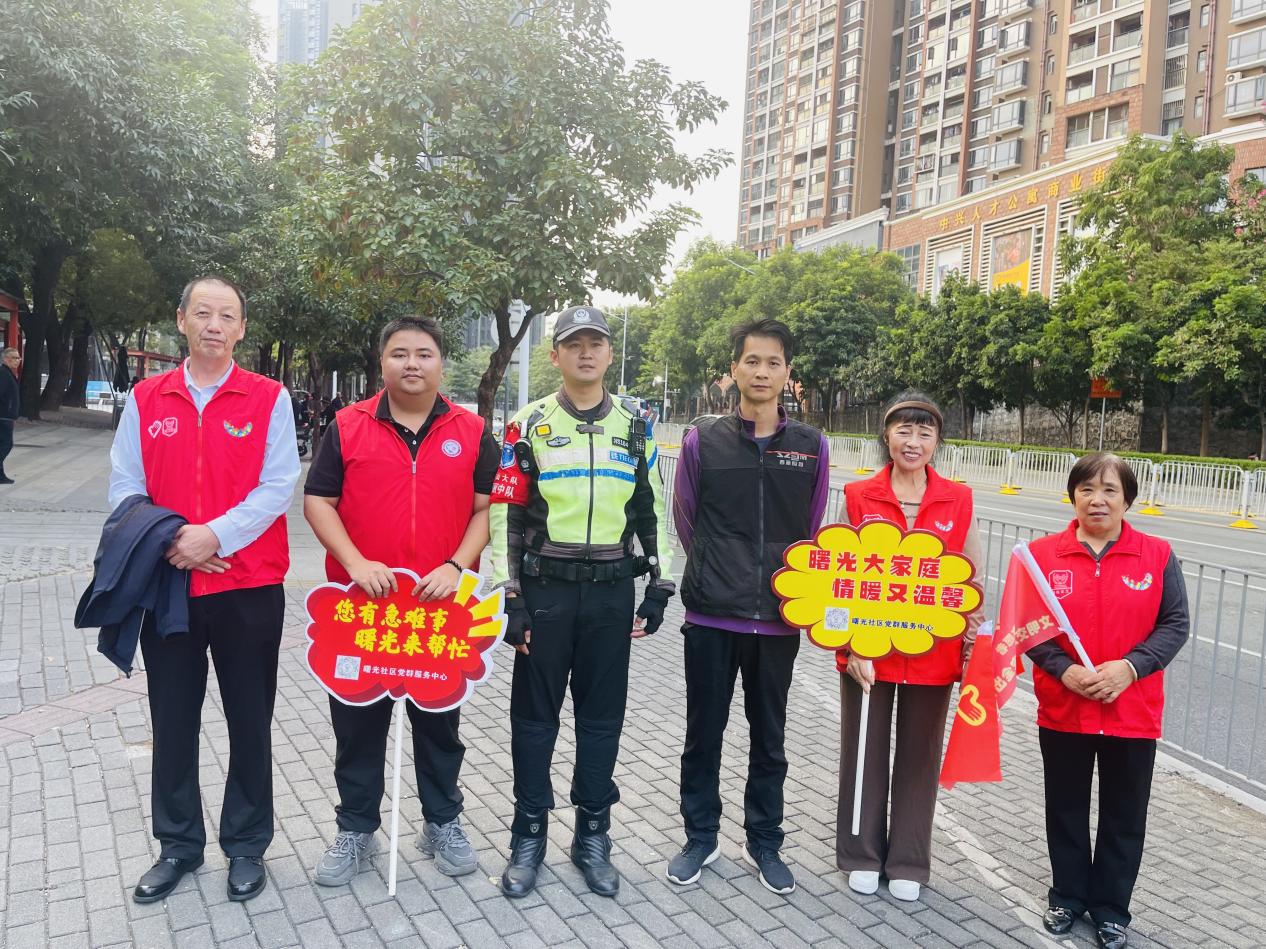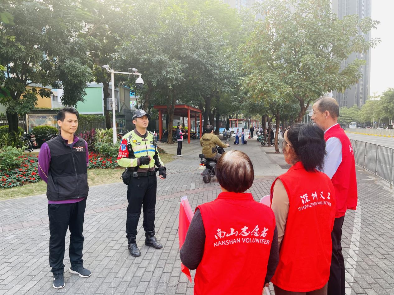 下午放学时段,深中南山创新学校十字路口人流如织。身着鲜红马甲的志愿者手持引导旗,以标准手势示意车辆暂停,一队小学生安全通过斑马线……这井然有序的一幕,正是南山区西丽街道曙光社区“校警社”三方联动交通劝导志愿服务启动后的一幕。