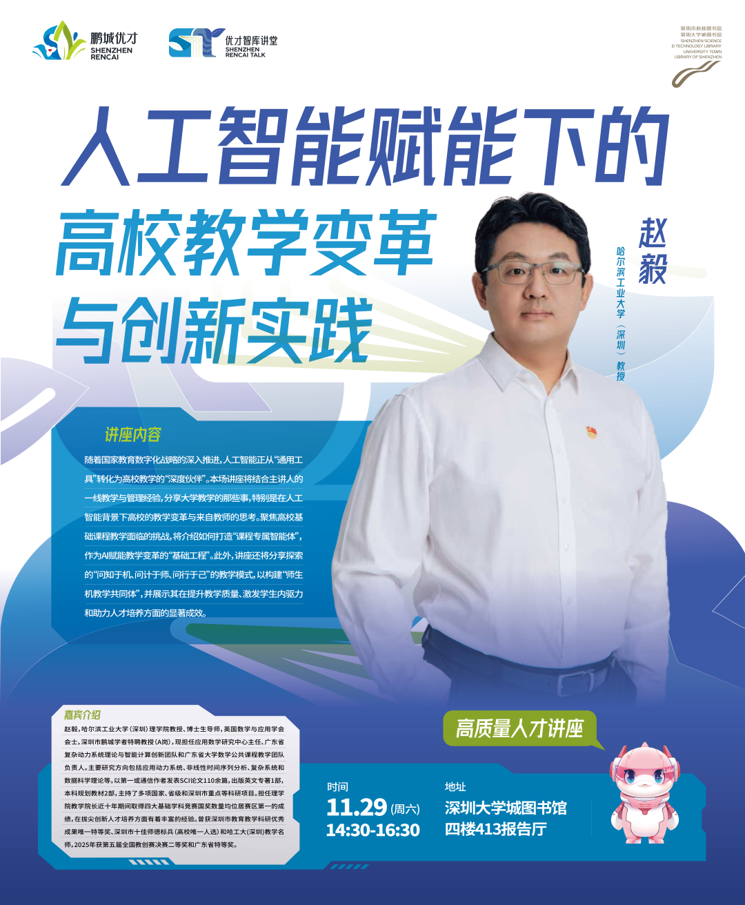 近日,“人工智能赋能下的高校教学变革与创新实践”讲座在深圳大学城图书馆四楼报告厅举办。本次讲座邀请哈尔滨工业大学(深圳)理学院教授、博士生导师、深圳市“鹏城优才卡”持卡人赵毅担任主讲嘉宾,吸引众多学生、教育研究者及AI教育爱好者到场参与,共同探讨人工智能时代高等教育的转型与创新。
