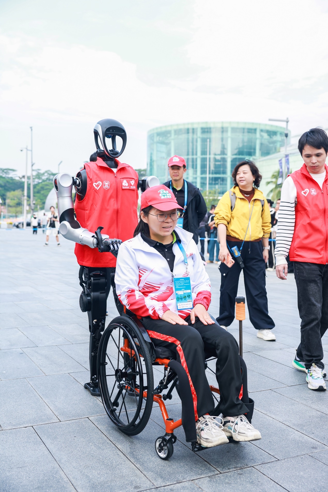 抵达深圳市当代艺术与城市规划馆后,一场科技与人文交融的体验环节成为活动亮点。馆门口亮相的机器人推轮椅服务,让队员们与残友代表倍感惊喜——这正是十五运会火炬传递现场的“0号火炬手”、全球首个5G-A人形机器人“夸父”。