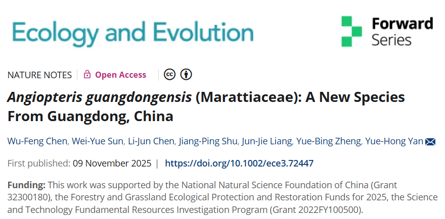 经过两年多的反复研究求证,近日广东江门恩平七星坑保护区(以下简称“七星坑保护区”)科研团队与深圳兰科中心、上海辰山植物园等科研机构在国际权威生态进化期刊Ecology and Evolution发表了本次成果:命名并描述了七星坑保护区内的蕨类植物新种——广东观音座莲(学名:Angiopteris guangdongensis )。