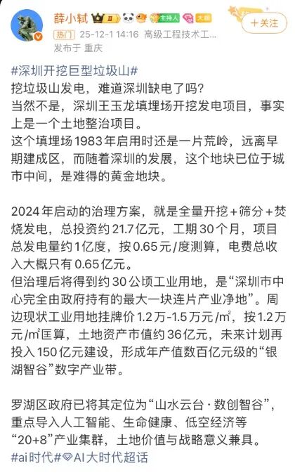身份认证为高级工程技术工程师的微博大V@薛小轼留言说:“这个地块已位于城市中间,是难得的黄金地块,罗湖区政府已将其定位为‘山水云台·数创智谷’,重点导入人工智能、生命健康、低空经济等‘20+8’产业集群,土地价值与战略意义兼具。”