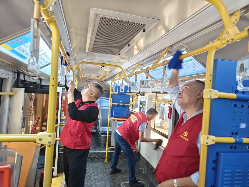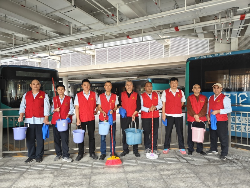 活动当日,前海大厦总站热闹非凡。党员、员工及车队管理人员等10多人身着鲜艳的红马甲,化身城市文明的使者,迅速投入到紧张而有序的清洁工作。他们分工明确、配合默契,不放过车厢内的任何一个卫生死角。车窗被擦拭得明亮如镜,仿佛能映照出城市的繁华;座椅和椅背被清理得一尘不染,为乘客提供舒适的乘坐体验;空调滤网经过仔细清洁,确保车内空气清新宜人;扶杆和拉手也被擦拭得锃亮,让乘客握起来更加安心。