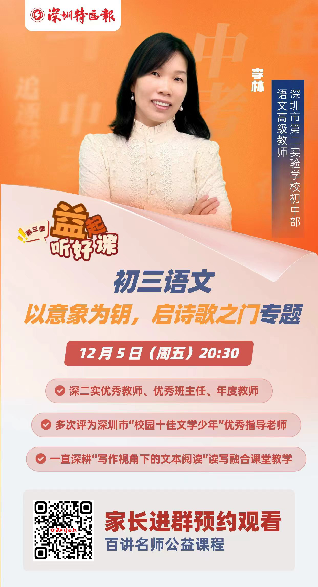 本期“深圳名师公益课堂”邀请来深圳市第二实验学校初中部语文高级教师李林老师,讲解“以意象为钥,启诗歌之门”专题。