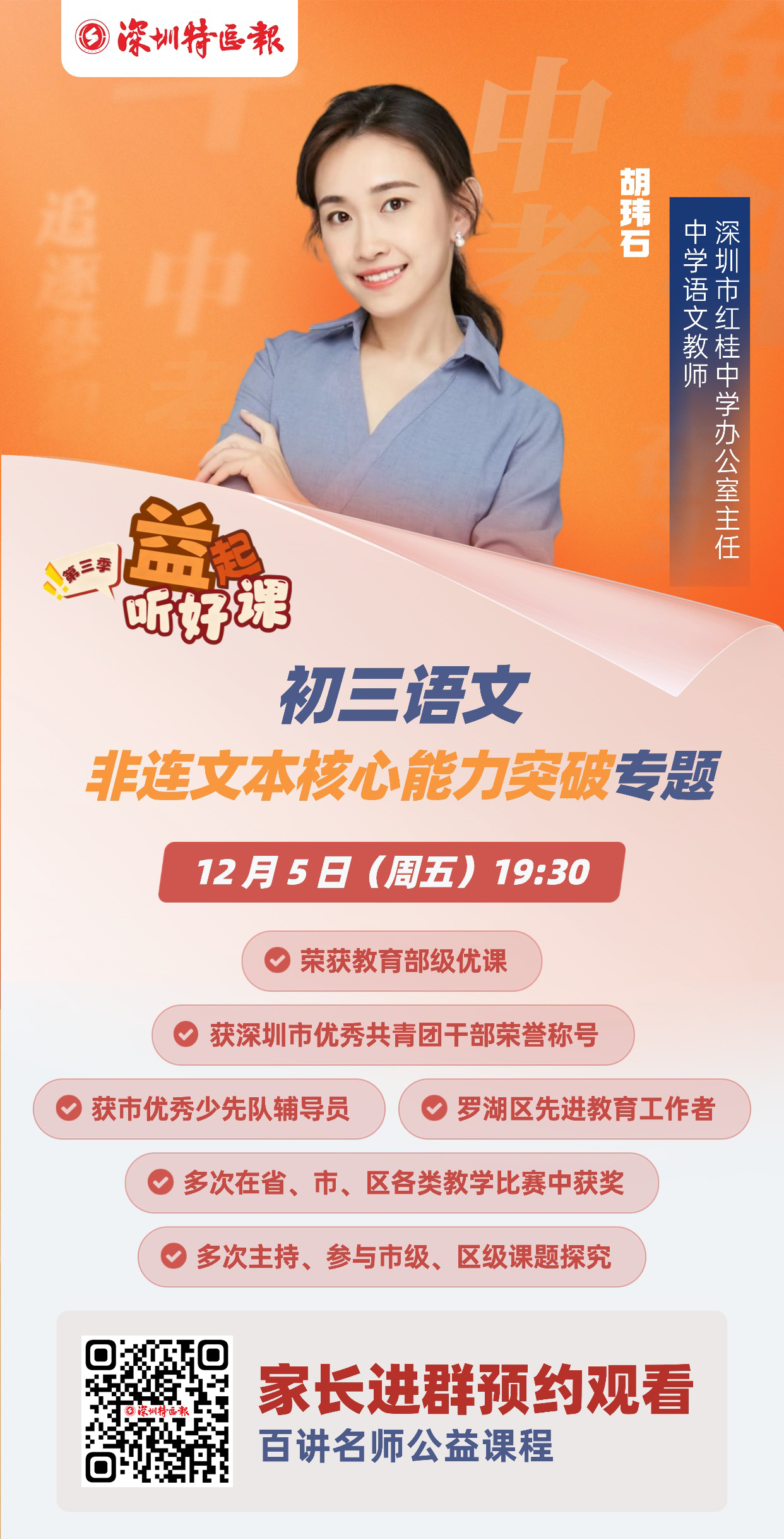 本期“深圳名师公益课堂”邀请来深圳市红桂中学语文教师胡玮石老师,讲解非连文本核心能力突破。