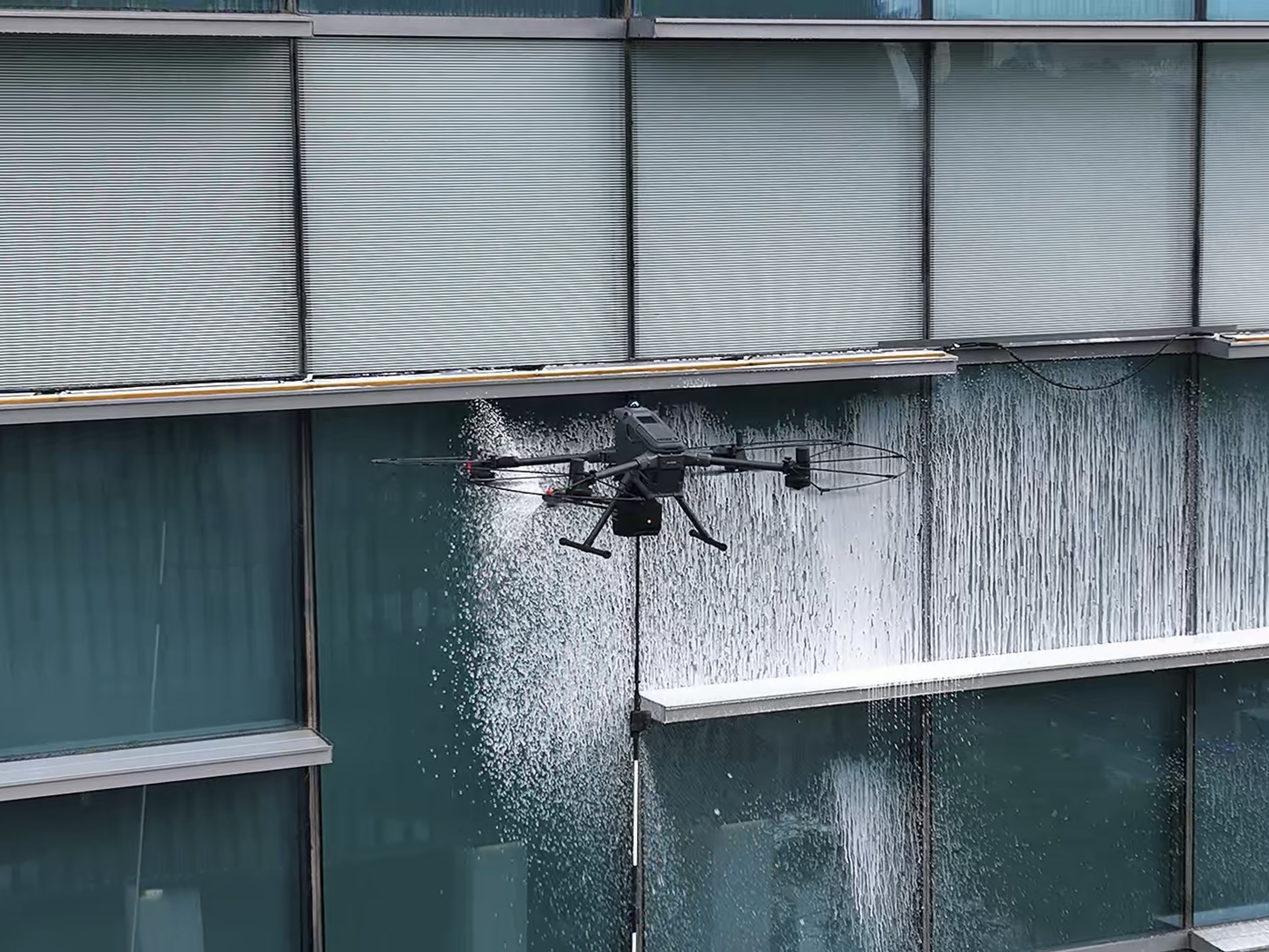 万勋科技柔韧臂配合无人机清洁楼宇幕墙。