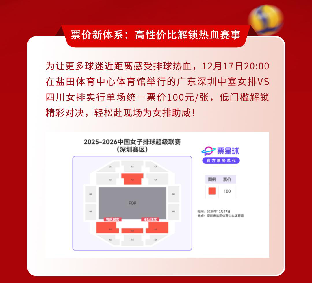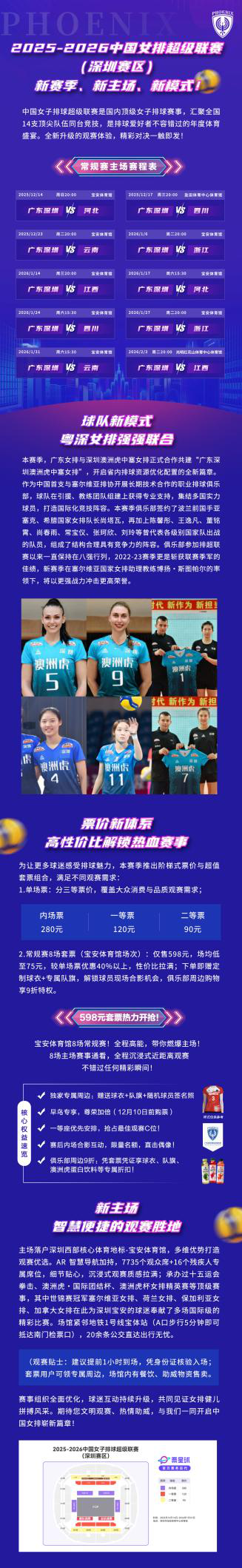 2025-2026中国女排超级联赛(深圳赛区)赛程官宣!双主场燃战模式全开——盐田场次已火热开售,主赛场宝安体育馆场次12月5日中午12:00准时开票!598元一等座超值套票直接包揽宝安8场常规赛,场均仅75元就能解锁顶流观赛体验,内场合影、专属球衣等重磅权益一键拿捏!购票速锁定俱乐部官方抖音、票星球、猫眼小程序/APP。