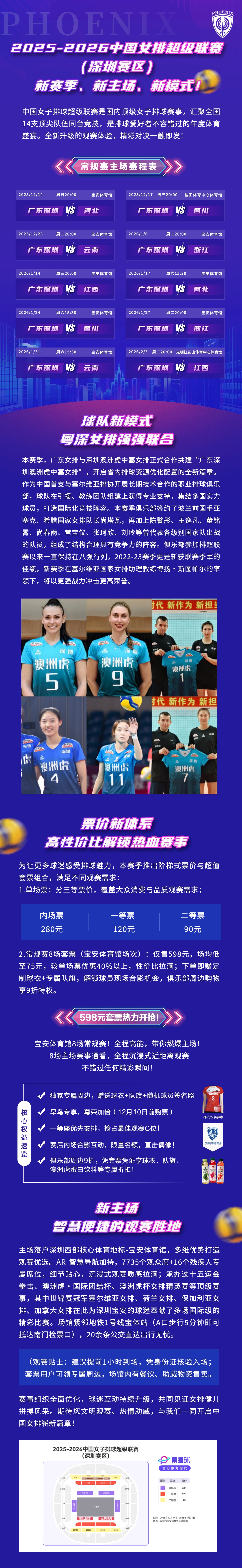 12月14日20时,广东深圳中塞女排将在宝安体育馆迎来2025-2026中国女排超级联赛赛季首秀,对手是河北女排。本场比赛门票将于12月5日12时正式开售。