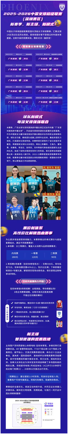 12月4日,2025-2026中国女排超级联赛(深圳赛区)全赛程正式公布。广东深圳女排将开启“盐田 + 宝安”双主场作战模式,其中盐田体育馆场次门票已火热开售,主赛场宝安体育馆场次门票将于12月5日中午12:00正式开票,超值套票与单场票同步上线,邀球迷共赴排球盛宴。