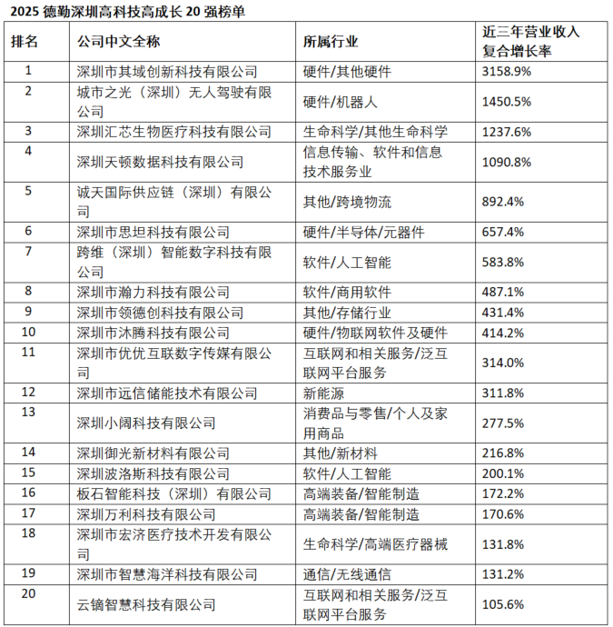 12月4日,2025德勤深圳高科技高成长20强及明日之星榜单在深出炉。记者从活动现场获悉,深圳市其域创新科技有限公司、城市之光(深圳)无人驾驶有限公司、深圳汇芯生物医疗科技有限公司荣登本年度深圳20强前三甲。尤为引人瞩目的是,前三甲近三年营业收入复合增长率惊人,分别为3158.9%、1450.5%、1237.6%。